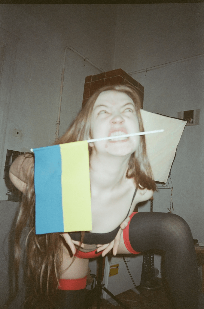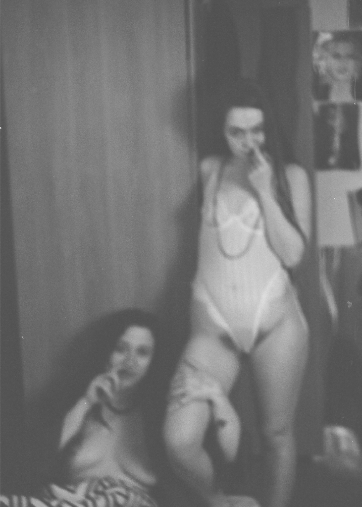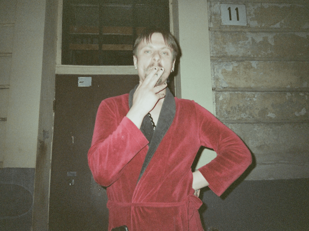 We observed each other. The camera passed from hand to hand, as if it were a separate organ, grown to capture our togetherness and farewell—with each other, with time itself. We knew that tomorrow might not leave us a chance to be together. Olia Yeremieieva mentioned that the body in war becomes the main target of destruction, the goal of terror, that war on many levels is synonymous with torture of the body. In her photos, Artur Snitkus playfully poses in a transparent bodysuit and covers himself with my robe.