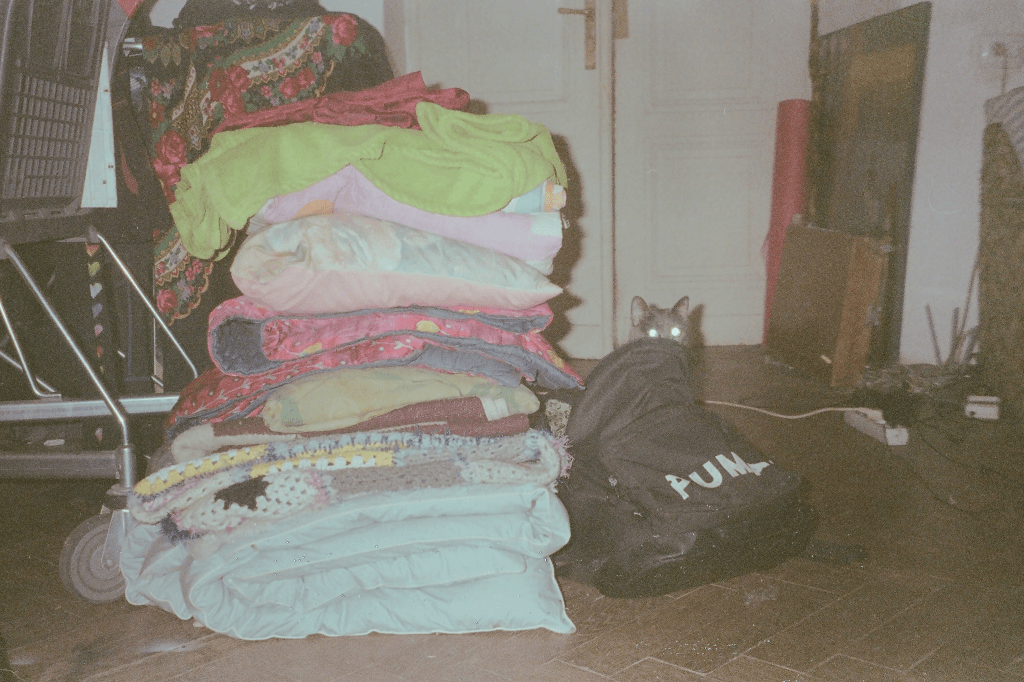 Pozhyly/we lived (2022) is a documentary-artistic archive capturing everyday life in Lviv during the first months of Russia’s full-scale invasion of Ukraine. In those days, the city became a temporary refuge, a maze of improvised logistics and daily survival. People poured in from all parts of the country, searching for safety. They slept on couches, floors, in kitchens — wherever there was space — with friends, acquaintances, and strangers.